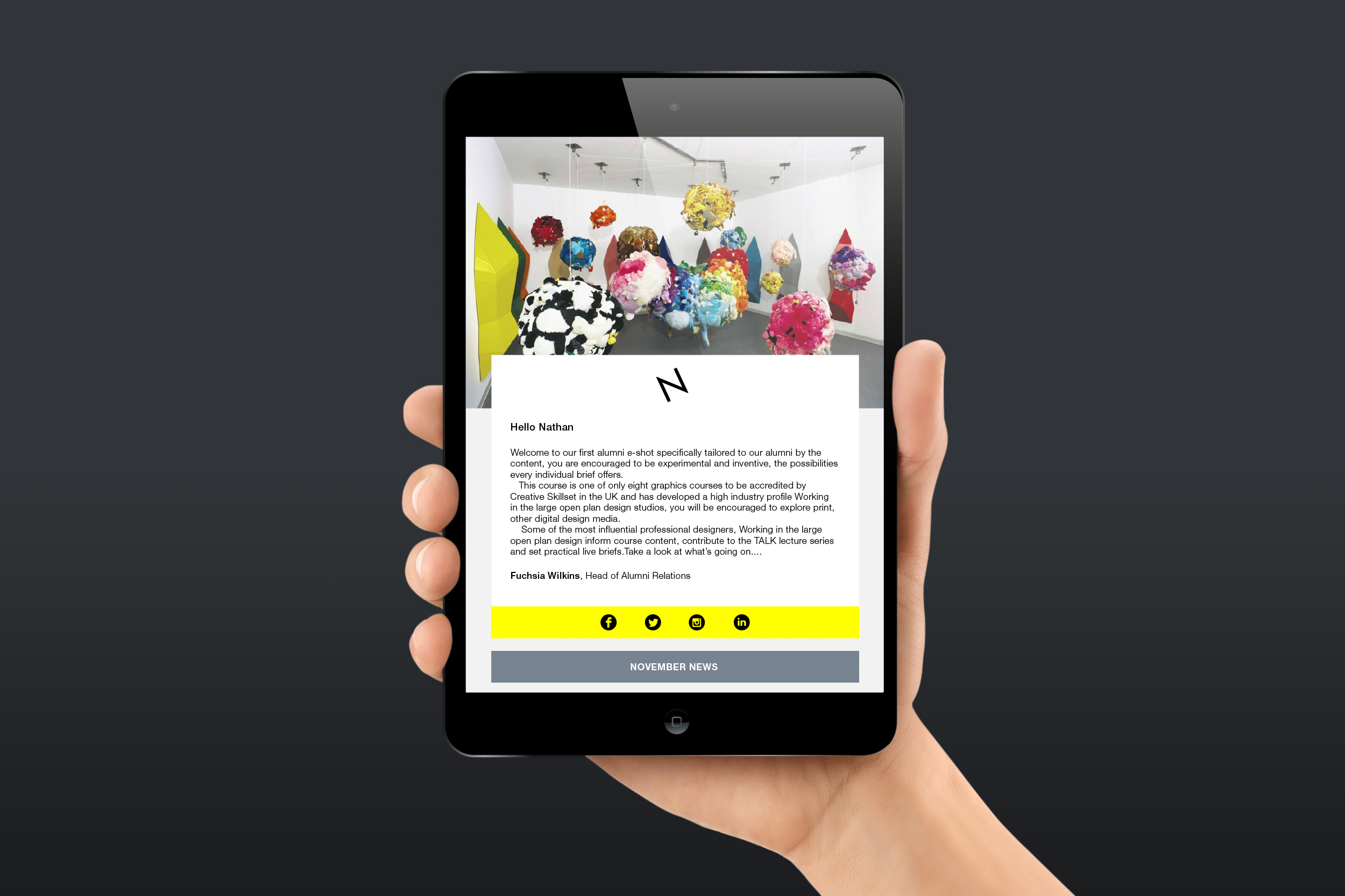 Working within NUA's design guidelines, Smith then designed and art directed the first issue - colabrating solely with NUA's current students and recent alumni. The magazine was produced as part of a wider project which included the redesign of the Alumni Development Dept's marketiong communications including the redesign of their e-newsletter to alumni and the Marketing Dept's e-shots - creating customisable and easy-to-use templates on MailChimp's email platform.