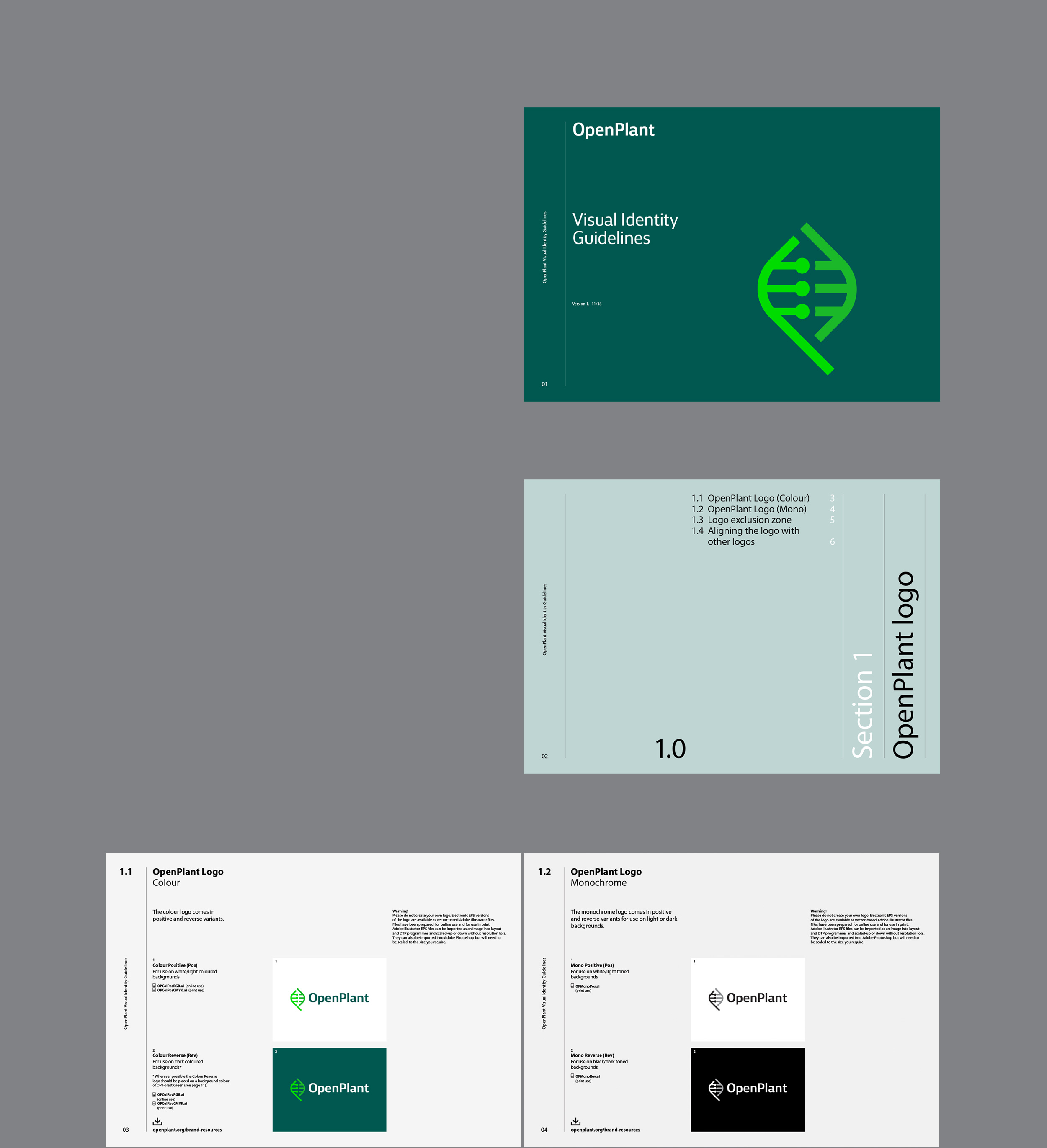 From there, Smith then designed two new 'parent' logo designs for OpenPlant and SynBio, each sharing the same visual components. Each identity drew from a common colour and font palette - used to create a family feel across the new identities. Smith graphic design agency then produced a family of 'child' variant logos - one for each of the sub-divisional organisations. An online visual identity guidelines manual was produced showing how users could use the new logo designs.